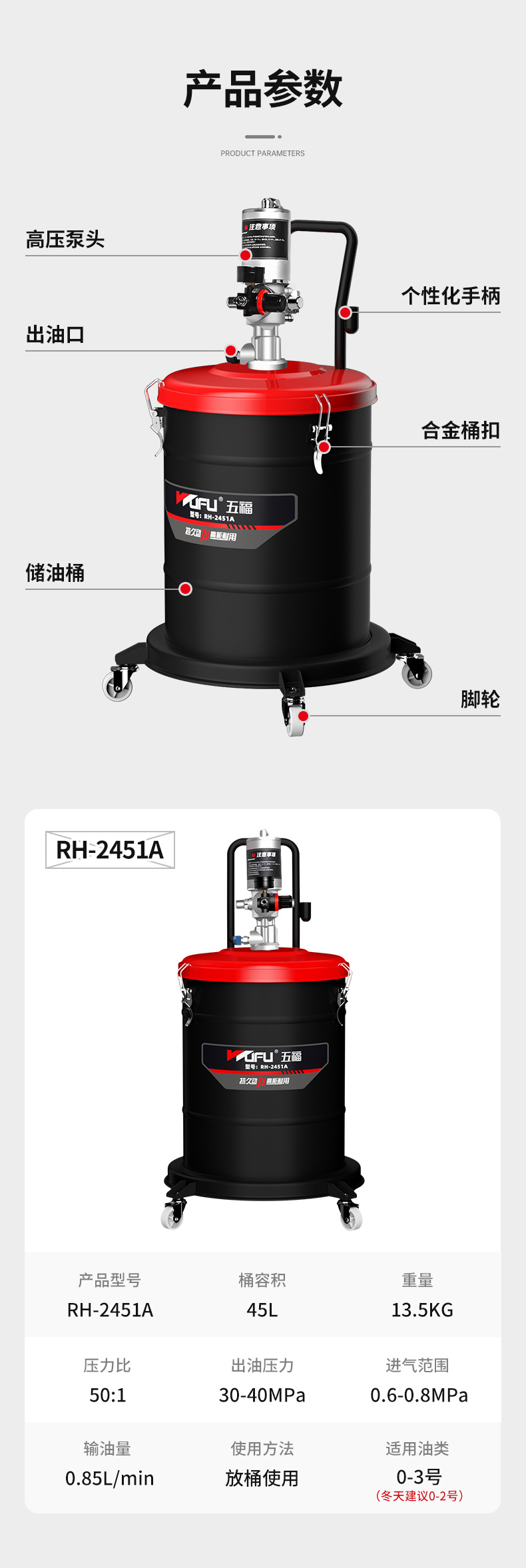 高压强劲有力,高效快速出油,优质压盘,紧贴桶壁不漏油,移动便捷,适用于工程机械、农用设备、机床加注、货运卡车润滑。