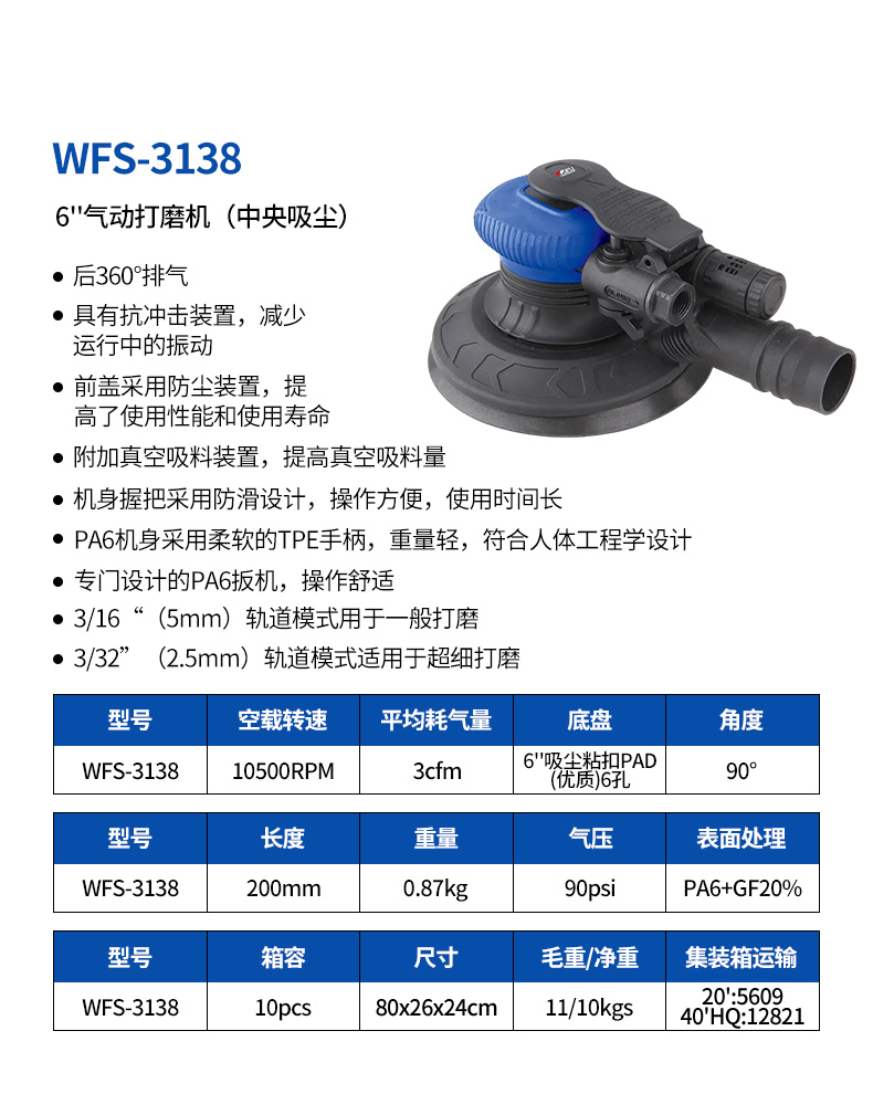具有抗冲击装置,减少运行中的振动;前盖采用防尘装置,提高了使用性能和使用寿命;附加真空吸料装置,提高真空吸料量.机身握把采用防滑设计,操作方便。适用于汽车美容、抛光除锈、木材打磨。