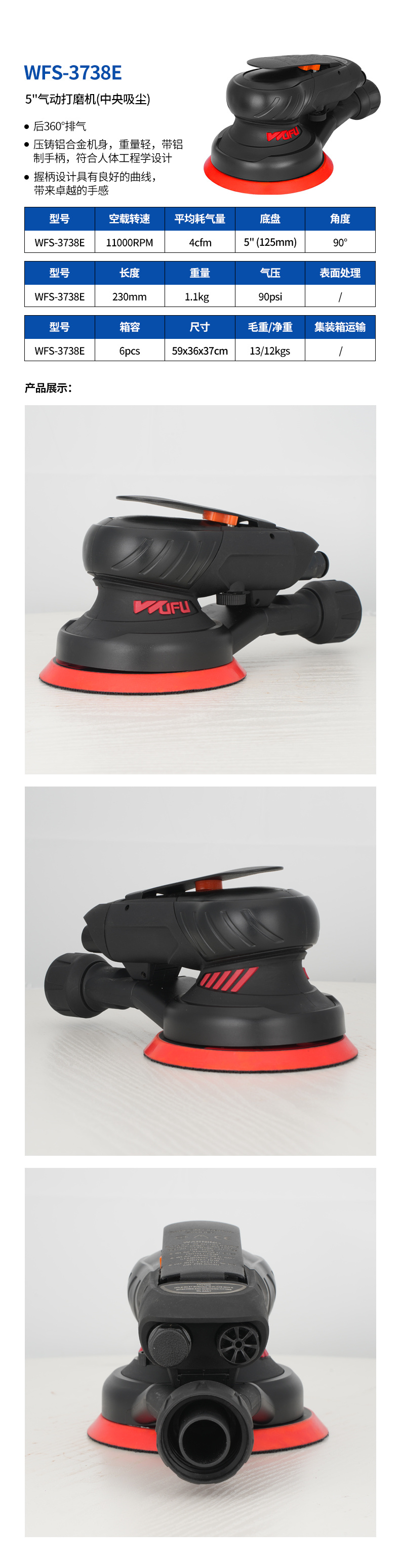 压铸铝合金机身,重量轻,带柔软手柄,符合人体工程学设计;握柄设计具有良好的曲线,带来卓越的手感。适合汽车美容。抛光除锈、木材打磨。