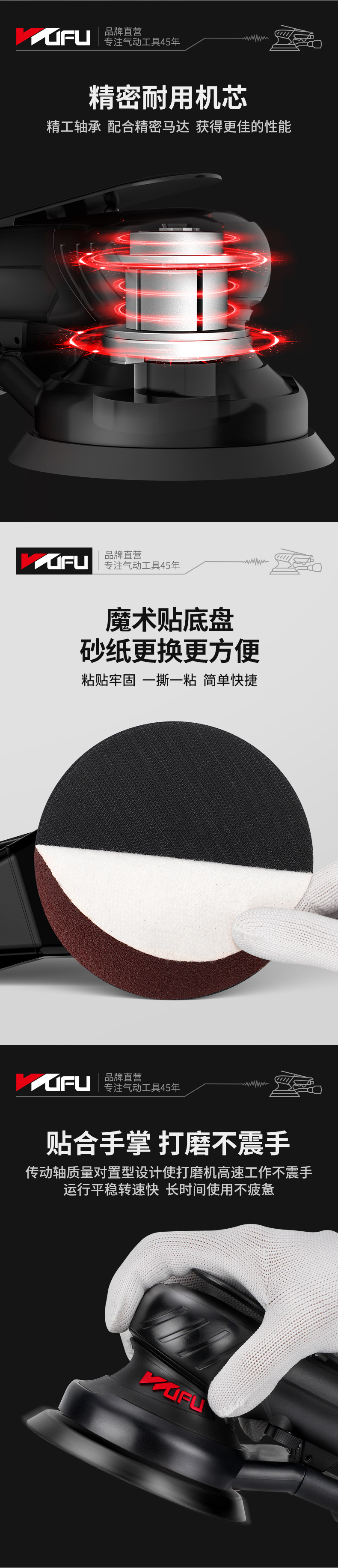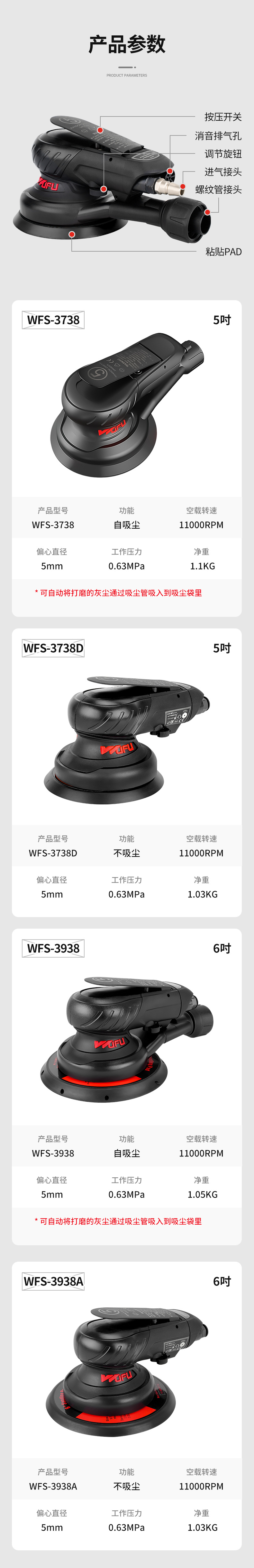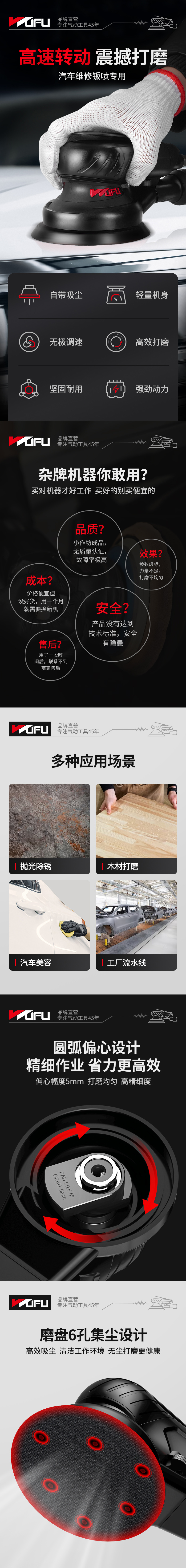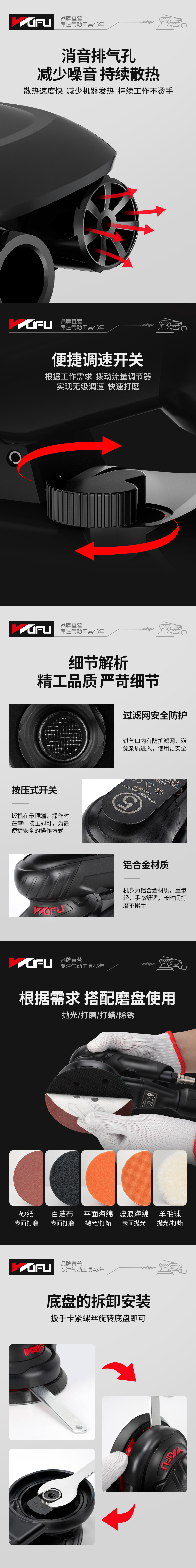 高速转动精密打磨,提高工作效率。可根据工作需求拨动流量调节器,实现无极调速。磨盘6孔集尘设计高效吸尘,清洁工作环境,无尘打磨更健康。适用于汽车美容、抛光除锈、木材打磨。