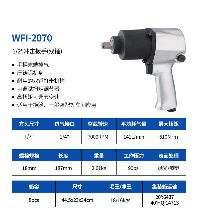压铸铝机身,耐用的双锤打击机构;可调试扭矩调节器;高扭矩可调节变速;适用于换胎、一般装配等车间应用。