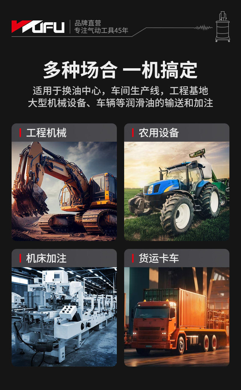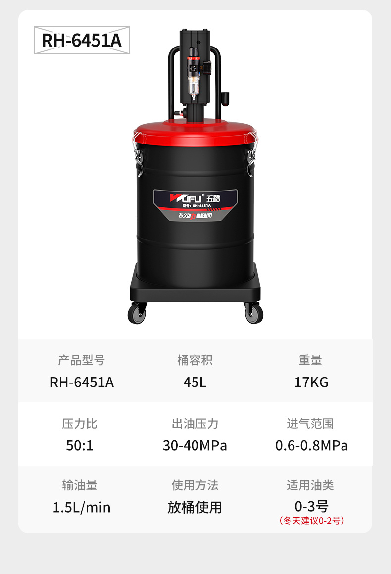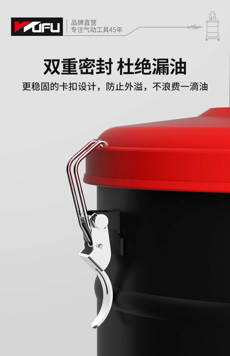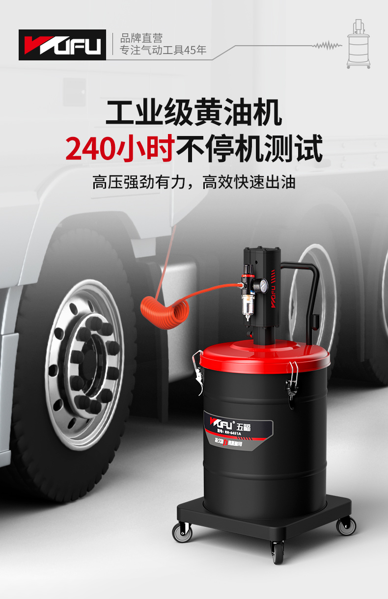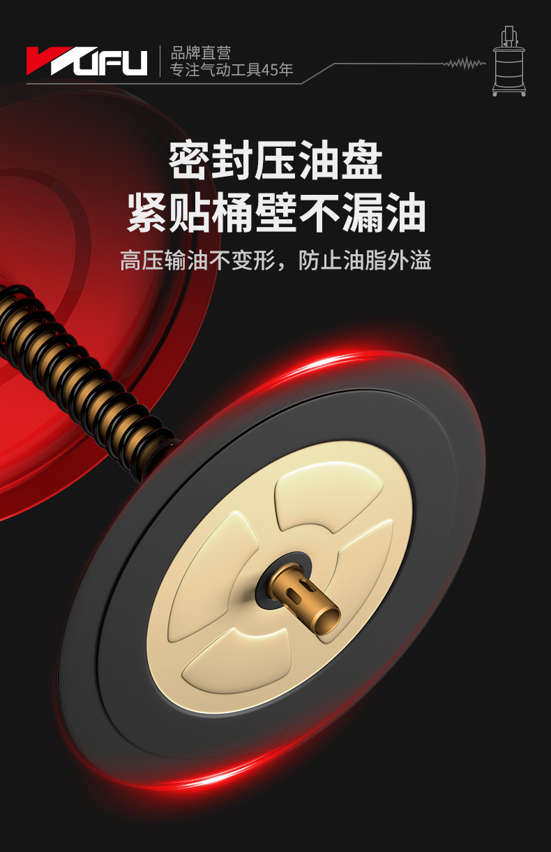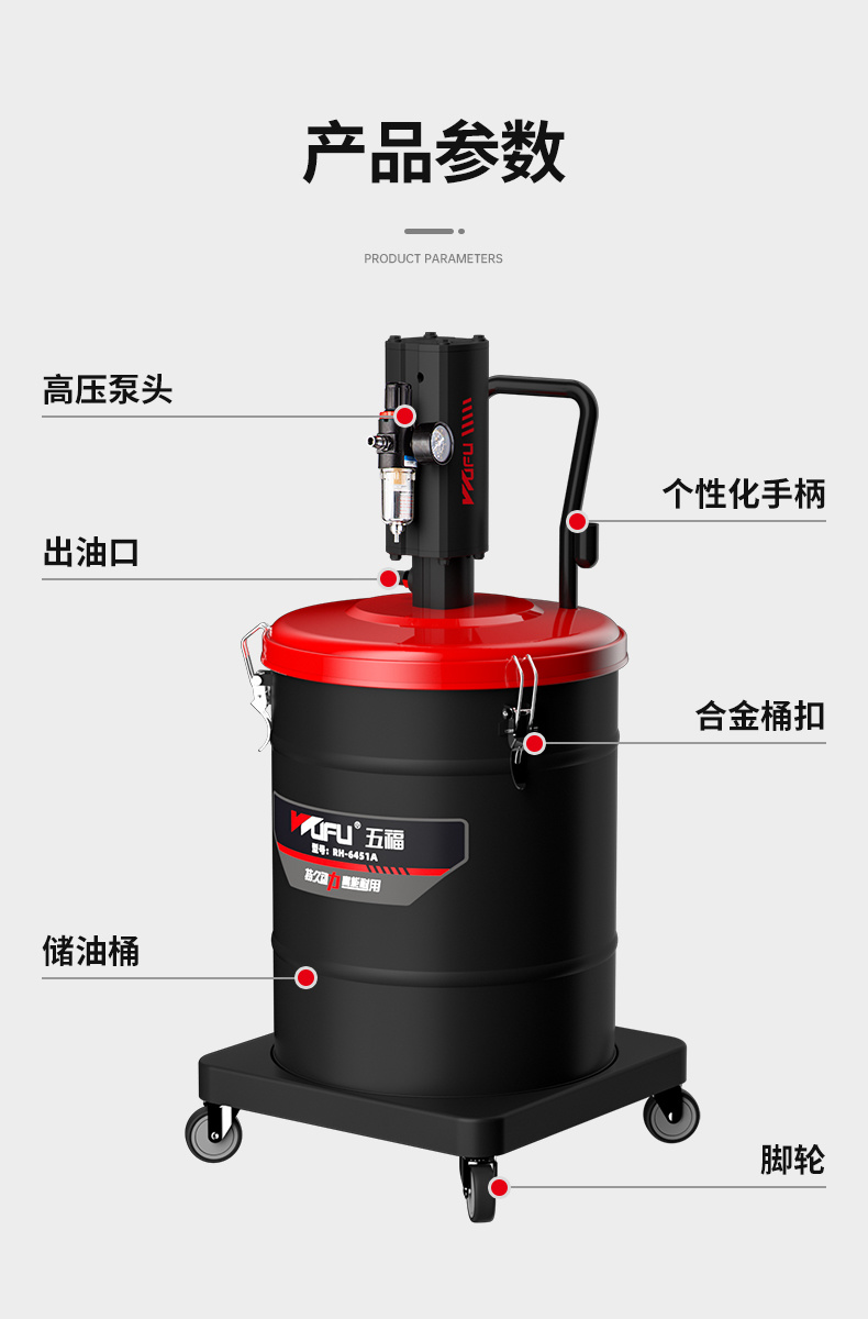 高压强劲有力,高效快速出油,优质压盘,紧贴桶壁不漏油,移动便捷,可放整桶黄油使用,适用于工程机械、农用设备、机床加注、货运卡车润滑。